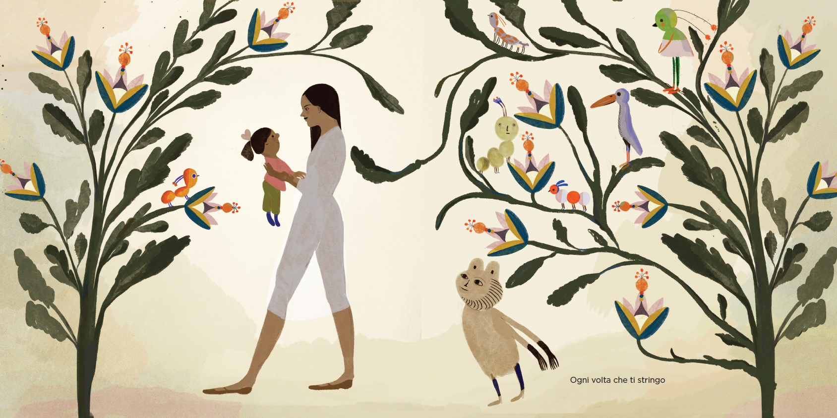 Every time a parent hugs, comforts, or calls their child by name, something secret happens: the love and nourishment they give returns to them, transformed. This book explores the intimate and fertile exchange between adults and children using the gentle formula: “Every time… it is you who…”. It offers a profound shift in perspective: as the child learns their first words, the parent discovers a new language; as the child plays hide-and-seek, the adult finds the joy of being exactly where they belong. Daniela Tieni’s extraordinary imagery beautifully hides and reveals the subtle, unbreakable threads that connect the act of receiving with the rain of gifts that touches those who care with love.