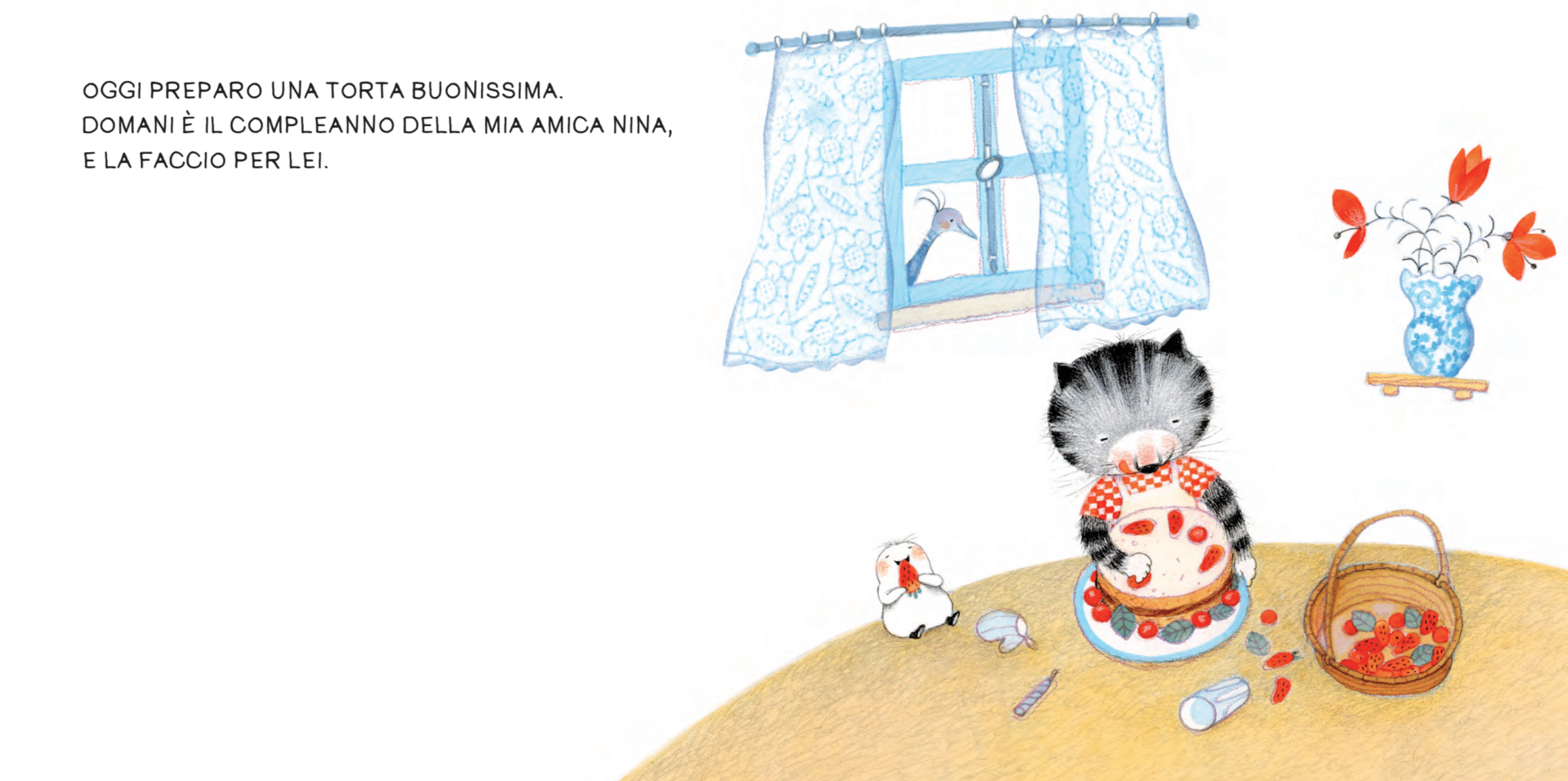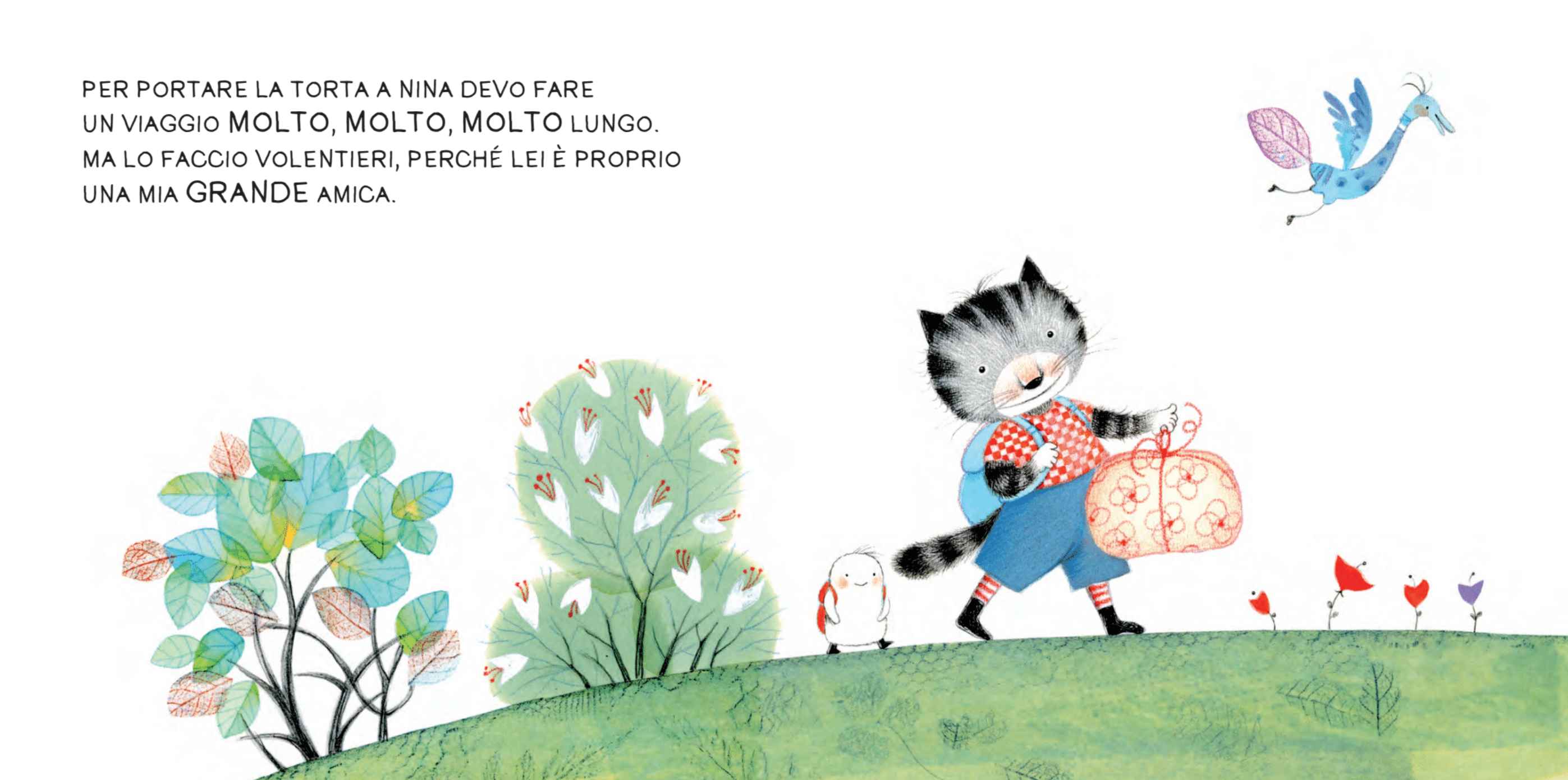 The day before Nina’s birthday, a little kitten bakes a cake and sets off on a very long journey. He travels across a vast, green landscape, meeting a wise owl and even a wolf—who he peacefully charms with his flute. After sharing a snack with ladybugs and sleeping under the stars, he finally reaches his destination to eat the cake with Nina. Only then is the mystery revealed: Nina is a giant, incredibly long serpent, and those endless fields were actually her back. The kitten had been traveling across his friend the whole time!