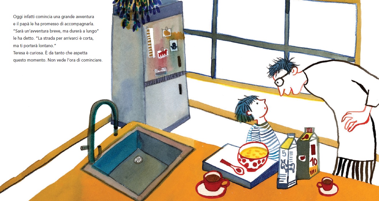 Teresa woke up full of excitement and questions. With her backpack ready and her favorite clothes on, she is eager to discover a world she doesn’t know yet. As she walks with her father, a tender and intimate dialogue begins. “Tell me what it’s like… did you go there too?” she asks. Through her father’s reassuring words, school is transformed into a place of pure wonder: a jungle to run through, a symphony to listen to, and secret planets to explore. This poetic journey prepares children for their first big step, framing school as a safe and welcoming harbor for all the “whys” in the world.