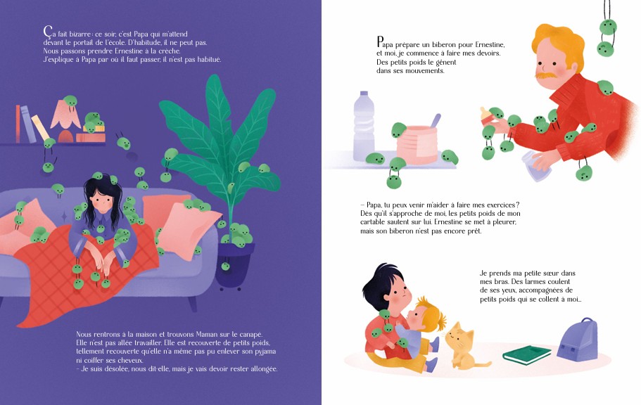 One morning, she can no longer get out of bed. So the whole family steps in: the child (the narrator), the dad, and even Uncle. Everyone pitches in—some organisation, a bit of humour, a lot of cooperation—and at last, the little weights begin to lift.